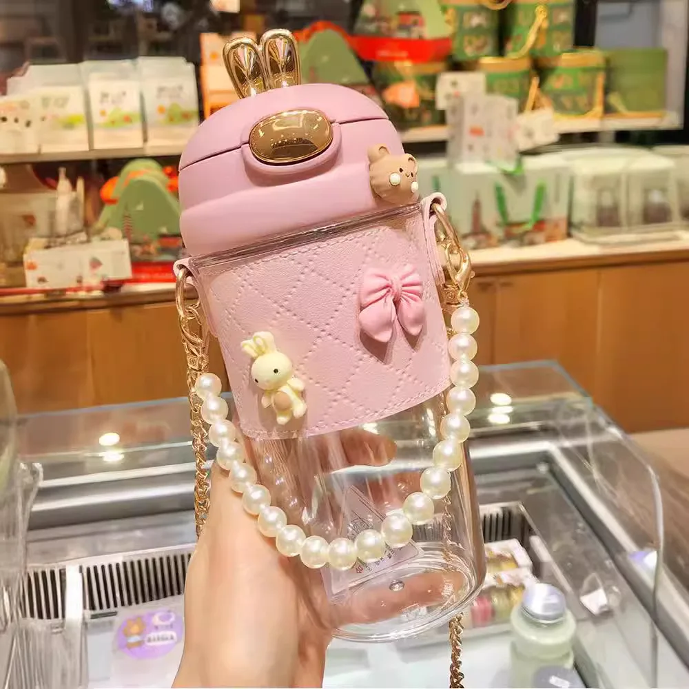 380ml/580ml Plastic water bottle for girls with leather sleeve strap straw Portable Leak-proof Anti Drop Sippy Cups for camping