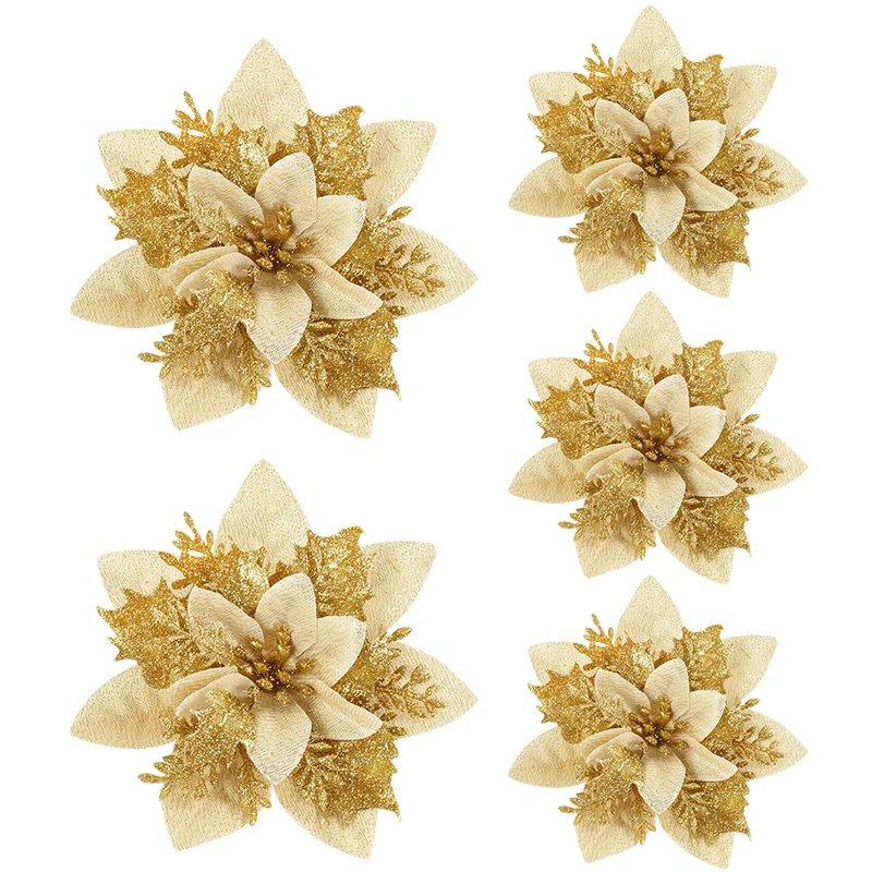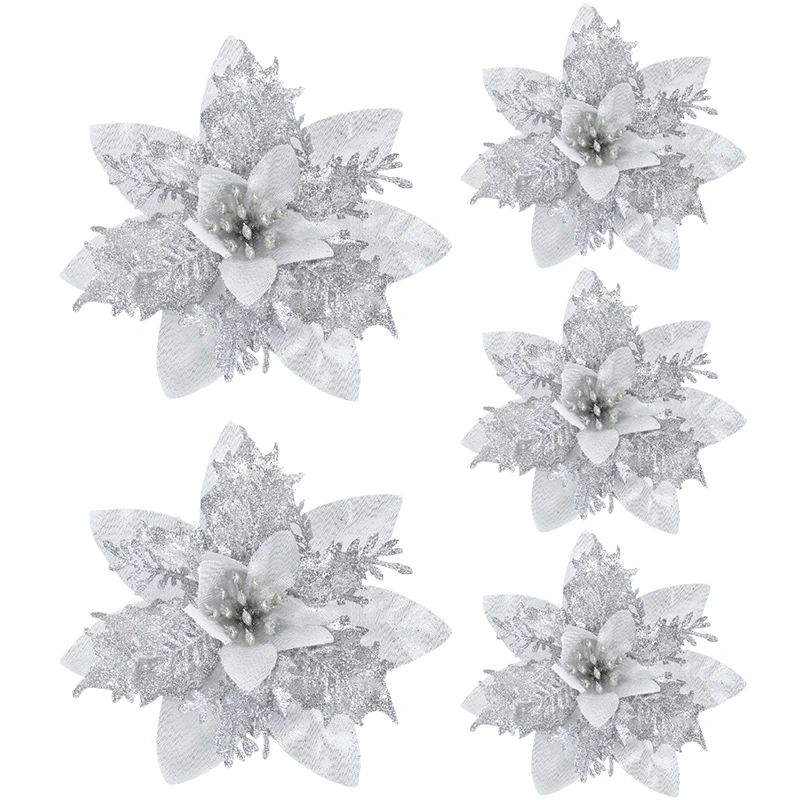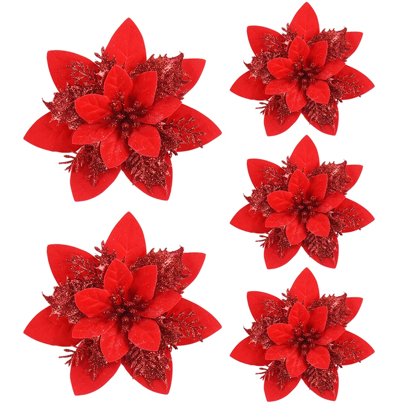 5/10Pcs Glitter Pink Christmas Flowers Xmas Tree 14cm Artifical Flower Ornaments