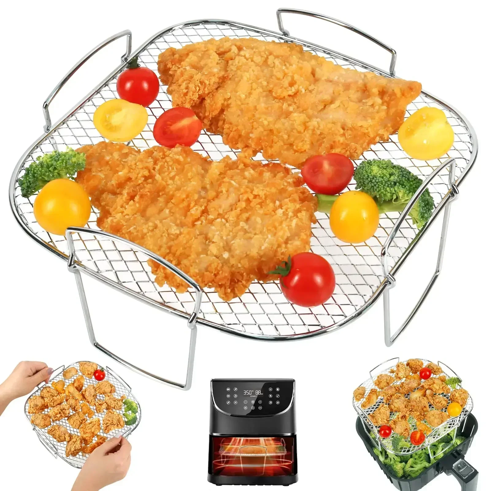 PREMIUM FOOD GRADE MATERIAL: Made of high quality food grade 304 stainless steel, sturdy, durable, rust-proof and high heat resistant, dishwasher safe, 100% safe for daily use. And the entire air fryer rack has been carefully polished without burrs, safe to use and nice touch.