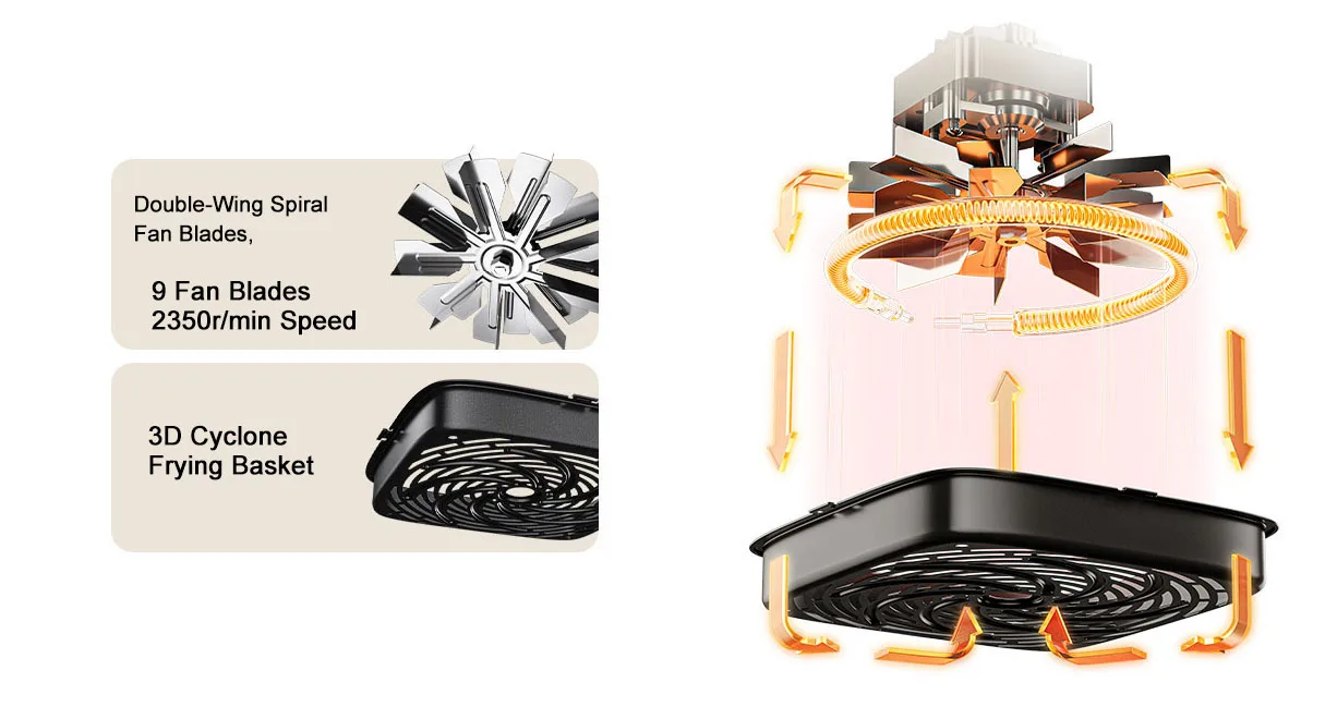 Double-Wing Spiral Fan Blades + 3D Cyclone frying basket
