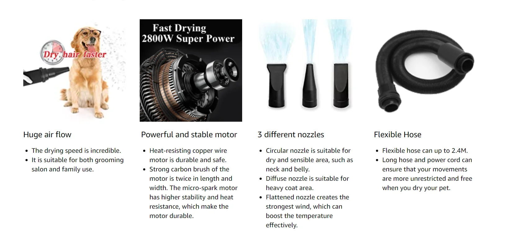 2800W premium powerful dryer can dry pets in a few minutes. 540g blow force is 3 times stronger than similar dryers 10% greater airflow than other single-stage dryers and help remove water from the fur efficiently.